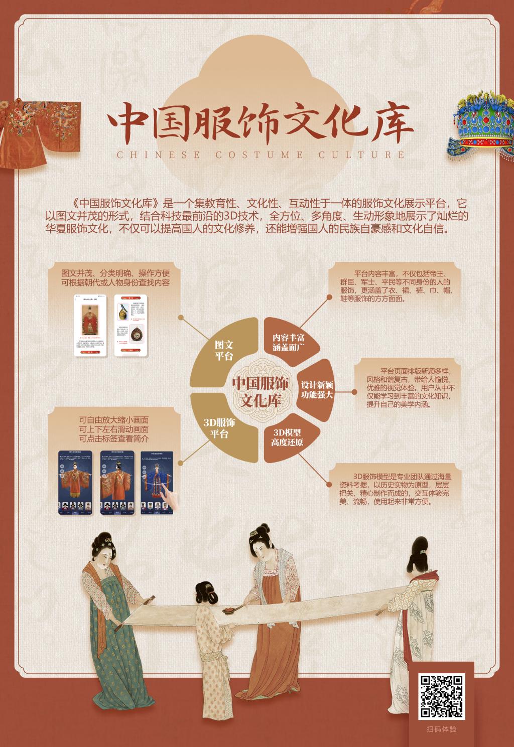 知识视界《历史的衣橱·中国服饰文化库》是一个集文化性、教育性、知识性、互动性于一体的服饰文化展示平台。平台以丰富的文本信息、精美的图片资源、以及立体逼真的3D模型为核心内容,全面介绍了中国历史上各个朝代不同的服饰类型,以及这些服饰背后所蕴含的文化内涵。 平台以图文并茂的形式,结合前沿的3D技术,全方位、多角度、生动形象地展示了灿烂的华夏服饰及其背后蕴藏的丰富文化背景。3D服饰模型均以考古发掘的历史实物或人们保存下来的珍贵实物为原型,最大限度地真实还原了古代服饰的原貌;模型由专业设计团队层层把关、精心制作而成,人物模型的外形注重与其身份相匹配,服饰力求高度还原;用户可以通过人机交互进行旋转、拉伸等方式,全方位、细致地欣赏3D服饰模型,查看服饰及配饰(帽子、配饰、手镯等)的部分细节;3D服饰模型均配以清晰、直观的图文介绍,对服饰的各个部分进行了解读,用户可以结合图文信息和3D模型进行学习、欣赏。